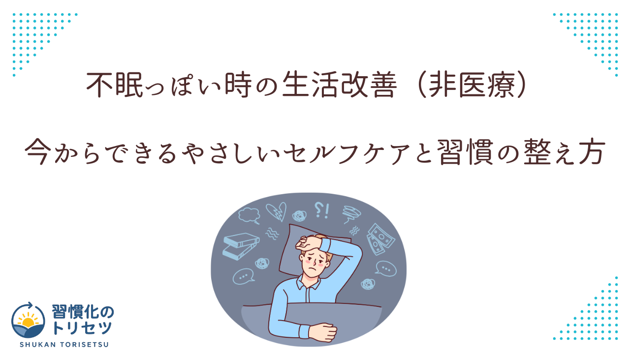 一方で、仕事や家事、育児で忙しいと、ゆっくり病院に行く時間も取りづらく、「まずは自分でできる範囲の生活改善から試してみたい」と感じる方も多いのではないでしょうか。そんなときにヒントになるのが「不眠っぽい時の生活改善(非医療)」という考え方です。